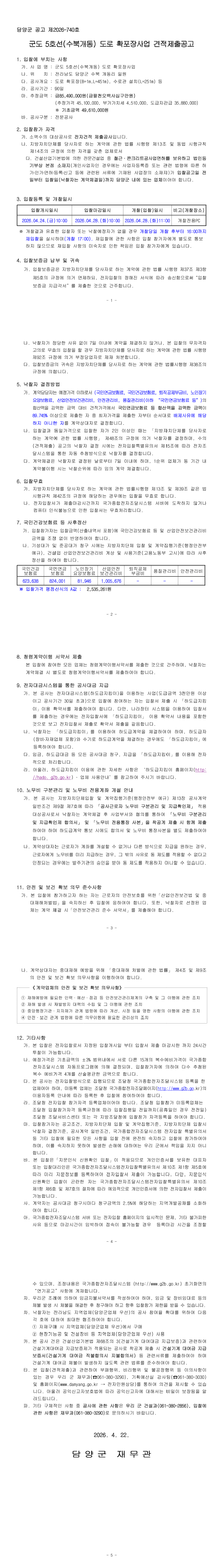 군도 5호선(수북개동) 도로 확포장사업 견적제출공고 |