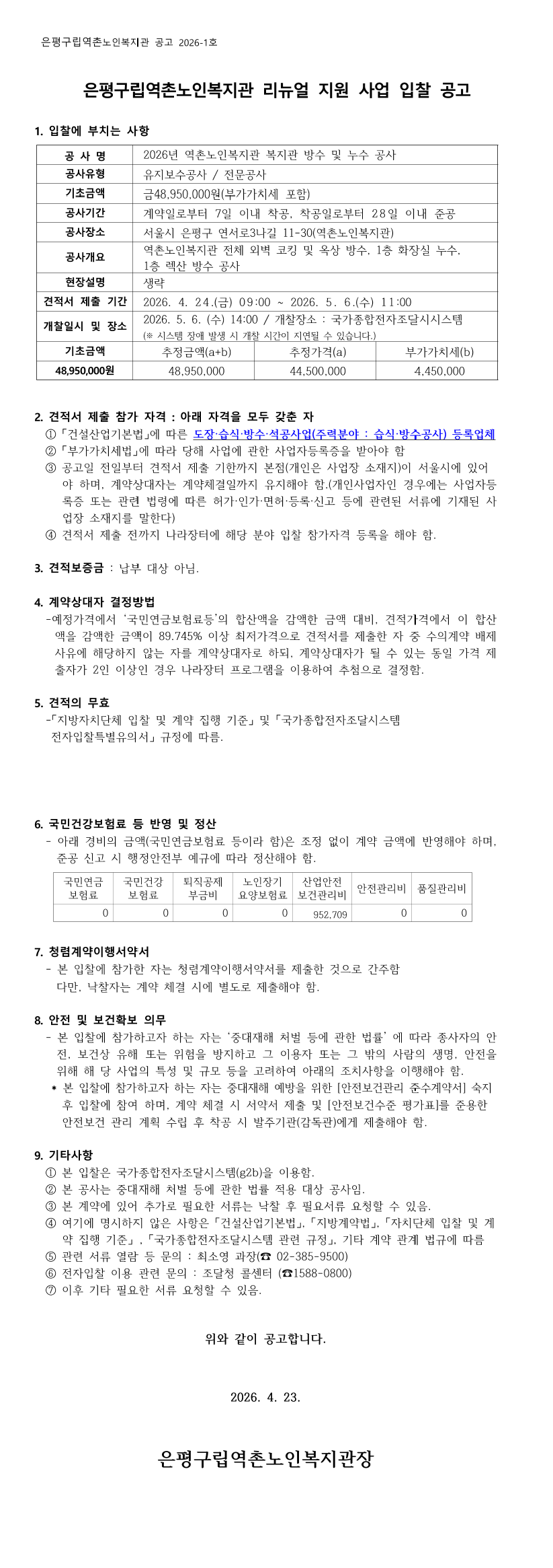 2026년 역촌노인복지관 복지관 방수 및 누수공사 |