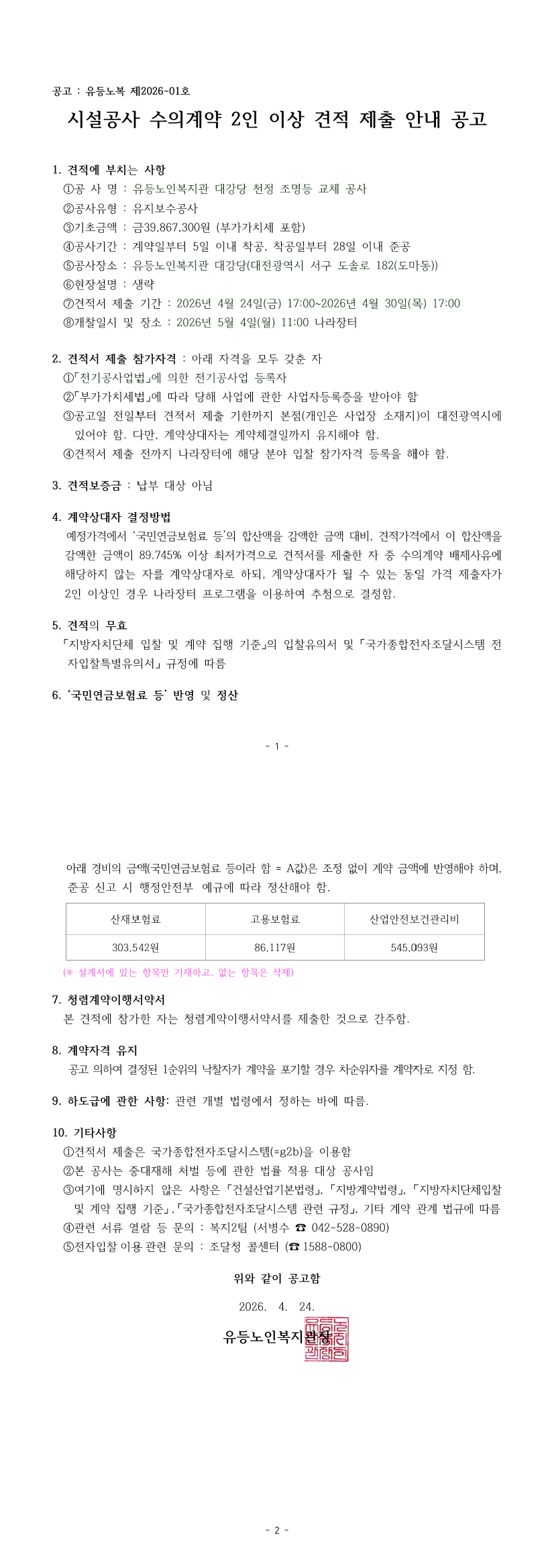 시설공사 수의계약 2인 이상 견적 제출 안내 공고 |