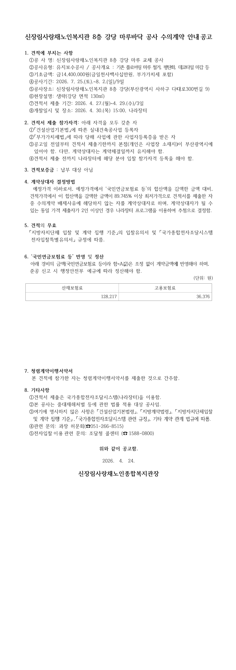 신장림사랑채노인복지관 8층 강당 마루 교체 공사 |