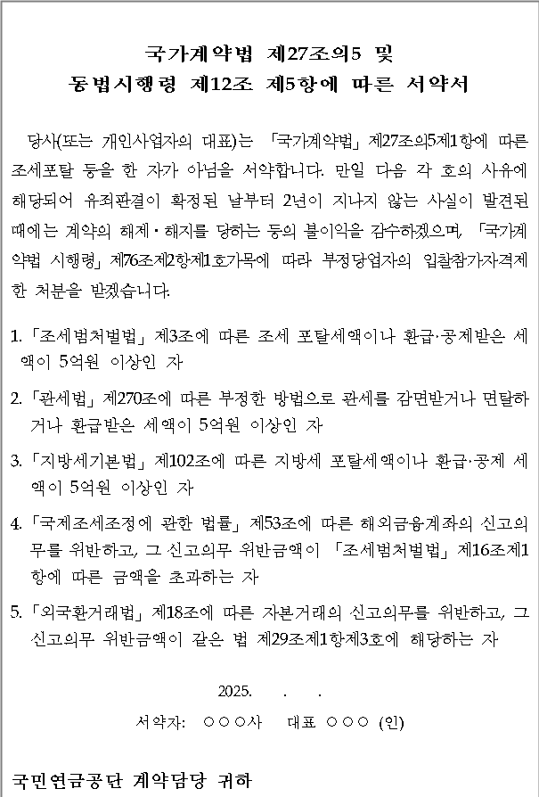 ※ 입찰자는 「국가를 당사자로 하는 계약에 관한 법률 시행령」 제12조제3항 각 호에 해당하지 아니한다는 서약서를 입찰 시 제출하여야 합니다. 만일 서약내용이 허위로 판명될 경우 계약의 해제·해지를 당할 수 있고, 부정당업자 입찰참가자격 제한 처분을 받을 수 있습니다. 다만, 나라장터 시스템을 이용하여 제출하는 경우에는 전자입찰서에 동 서약서의 내용을 포함하고 있으므로 전자입찰서 제출로 서약서 제출을 갈음합니다.