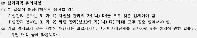 ※ 입찰자가 면세사업자인 경우 입찰 금액은 반드시 부가가치세를 포함한 가격으로 투찰해야 하며, 입찰 결과 낙찰자가 면세사업자인 경우 계약 금액은 낙찰 금액에서 부가가치세 상당액을 차감한 금액으로 합니다.
