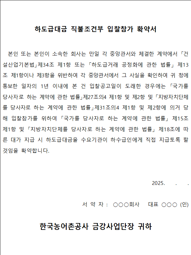 3) 입찰에 참여하는 자는 「국가를 당사자로 하는 계약에 관한 법률」 제27조의4에 따라 각 중앙관서의 장으로부터 「건설산업 기본법」 제34조제1항 또는 「하도급거래 공정화에 관한 법률」 제13조제1항이나 제3항을 위반한 사실이 통보된 자로서 당해 입찰공고일이 위반사실 통보일로부터 1년 이내인 것으로 확인된 때에는 「같은 법」 제15조제1항에 따른 대가지급 시 “하도급대금을 수요기관이 하수급인에게 직접 지급하는 것에 합의한다”는 내용의 확약서를 제출하여야 합니다.