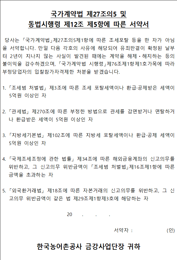 이를 위반한 사실이 드러날 경우, 해당 입찰·낙찰을 취소하거나 계약을 해제·해 지하여도 감수하겠으며, 민․형사상 이의를 제기하지 않겠습니다.