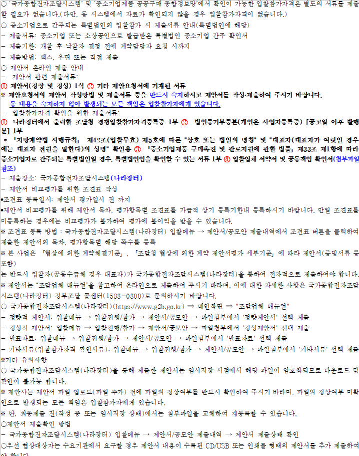 ※ 본 건은 추정가격 5억 미만 사업으로 별도 제안서 발표는 없으나, 평가진행시 평가위원이 제시한 질의에 대하여 해당 업체별로 실시간 온라인(나라장터) 답변등록해야 합니다.