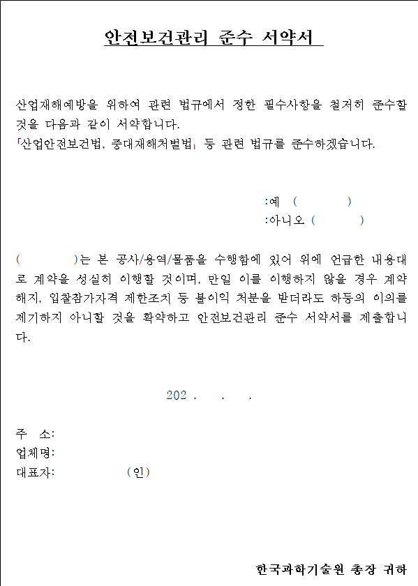 나. 본 입찰(견적)에 참가하고자하는 자는 중대재해 예방을 위한 안전 및 보건 확보 의무사항을 숙지하신 후 입찰(견적)에 응하여야 하며, 계약 체결 시에 【붙임-2】「안전보건관리 준수 서약서」를 제출하여야 합니다.