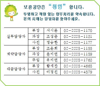 국가전자종합조달시스템(www.g2b.go.kr), 우리 공단 홈페이지 (www.bohun.or.kr), 기획재정부 알리오(http://alio.go.kr) 확인 가능합니다.