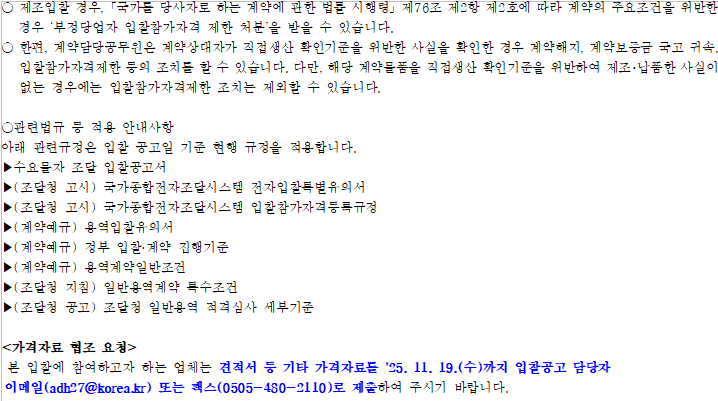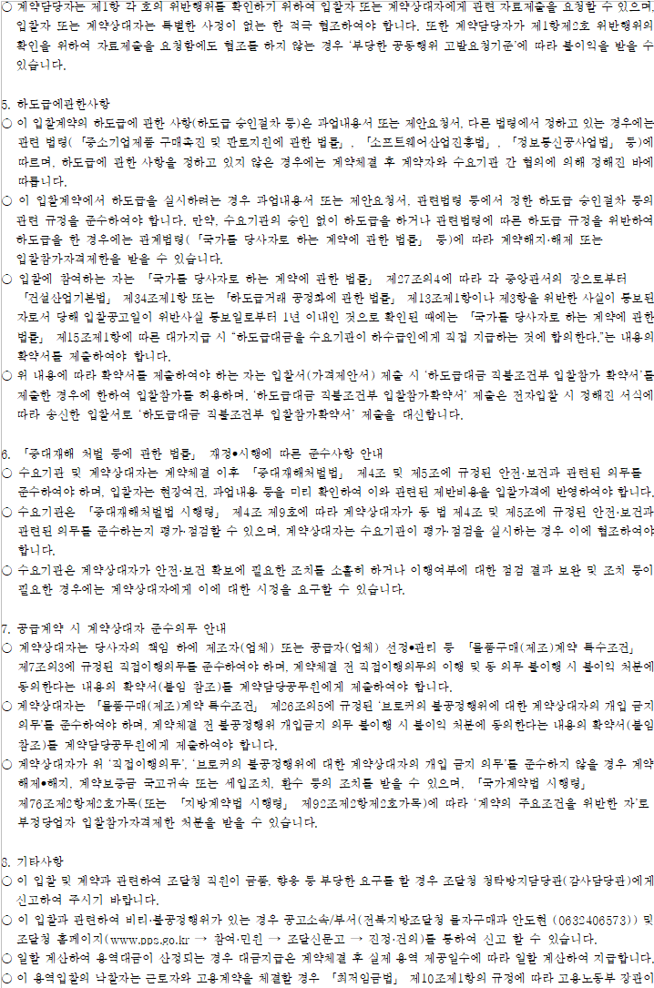 - 이 입찰 공고 건은 「국가를 당사자로 하는 계약에 관한 법률 시행령」 제73조와 「(계약예규) 정부 입찰․계약집행기준」 제19장에 따라 기성대가 및 준공대가 지급 시 산업안전보건관리비 등을 사후 정산하게 됩니다.