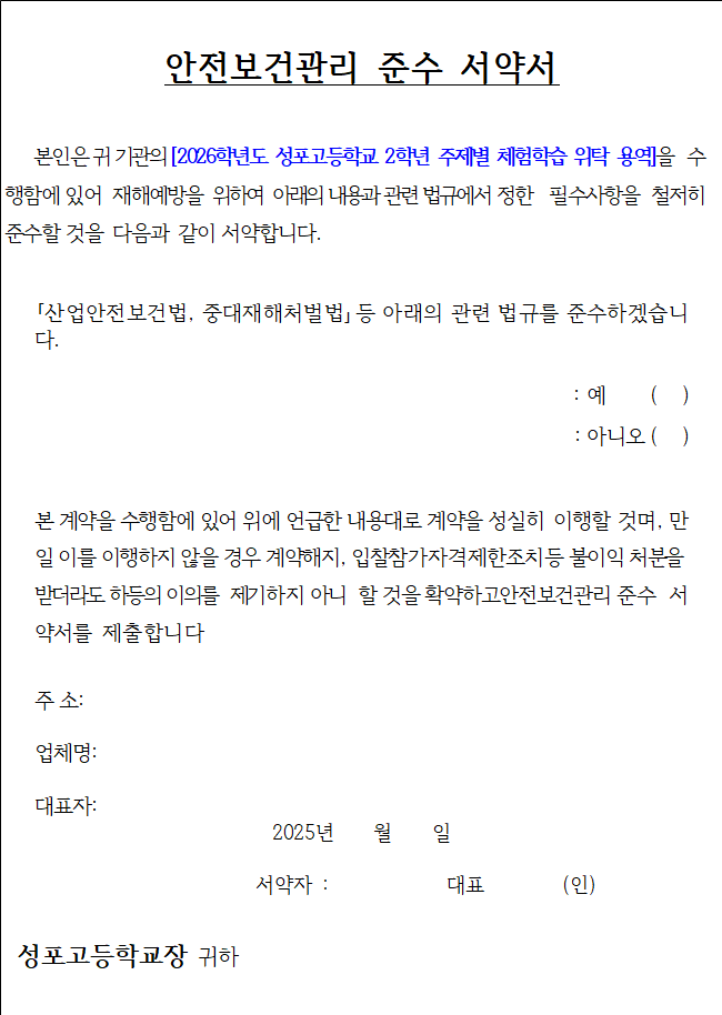 위와 같이 계약조건에 따라 2026학년도 성포고등학교 주제별 체험학습에 필요한 제 준비가 완료되었음을 보고합니다.