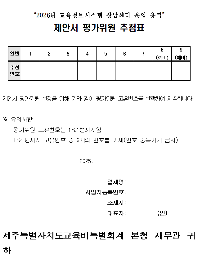 - 계약상대자로 선정된 업체는 대표자가 날인하여 계약체결 시에 제주특별자치도교육청에 별도로 제출하여야 합니다.