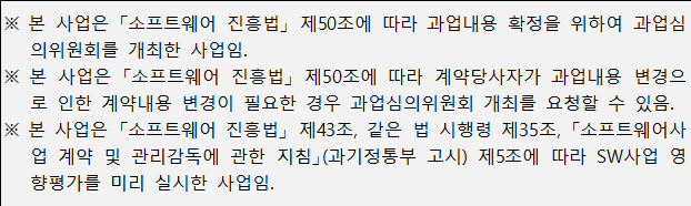 3) 본 사업은 「소프트웨어 진흥법」 제48조제2항 및 「중소 소프트웨어사업자의 사업 참여 지원에 관한 지침」 (과학기술정보통신부고시)에 의거 대기업은 입찰에 참여할 수 없음