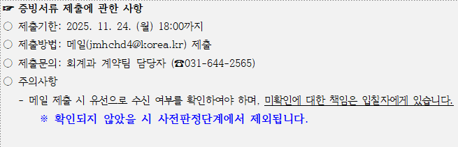 - 입찰자가 면세사업자인 경우 입찰 금액은 반드시 부가가치세를 포함한 가격으로 투찰해야 하며, 입찰 결과 낙찰자가 면세사업자인 경우 계약 금액은 낙찰 금액에서 부가가치세 상당액을 차감한 금액으로 합니다.