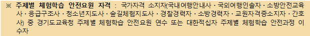 ※ 안전요원(주간, 야간)은 경기도교육청 「안전한 주제별 체험학습 운영지침」에 명시된 자격자로 업체는 안전요원을 채용전에 성범죄 경력·아동학대 관련 범죄조회 실시 결과 이상이 없는 자를 선발한다. 추후, 주제별 체험학습 실시 10일전까지 구비서류(안전교육이수증, 조회결과회신서 등)를 제출해야 한다.