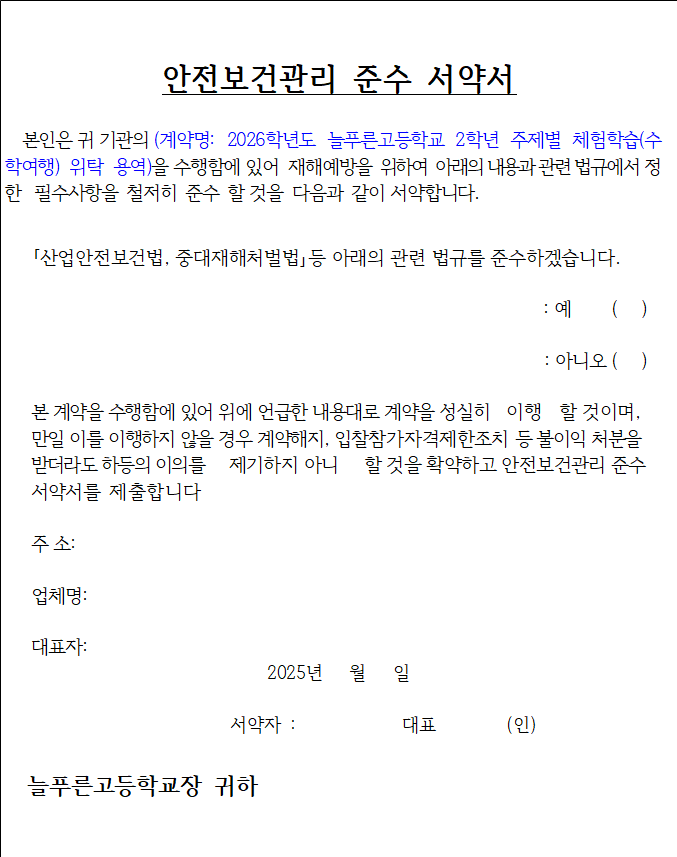 2026학년도 늘푸른고등학교 2학년 주제별 체험학습(수학여행) 위탁 용역