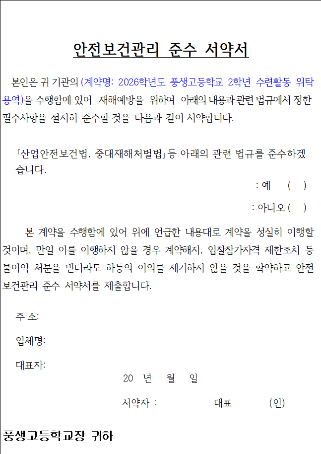 위 청렴계약 이행서약서(각서)는 상호신뢰를 바탕으로 한 약속으로서 반드시 지킬 것이며, 낙찰자로 결정될 시 본 서약내용을 그대로 계약특수조건으로 계약하여 이행하고, 입찰참가자격 제한, 계약해지 등 서정고등학교의 조치와 관련하여 당사가 풍생고등학교를 상대로 손해배상을 청구하거나 당사를 배제하는 입찰에 관하여 민․형사상 어떠한 이의도 제기하지 않을 것을 서약합니다.