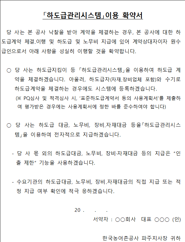 본인 또는 본인이 소속한 회사는 만일 각 중앙관서와 체결한 계약에서 「건설산업기본법」제34조제1항 또는 「하도급거래 공정화에 관한 법률」 제13조제1항이나 제3항을 위반하여 각 중앙관서에서 그 사실을 확인하여 귀 청에 통보한 일자의 1년 이내에 본 건 입찰공고일이 도래한 경우에는 「국가를 당사자로 하는 계약에 관한 법률」제27조의4 제1항 및 제2항에 의거 당해 입찰참가를 위하여 「국가를 당사자로 하는 계약에 관한 법률」 제15조제1항에 따른 대가 지급 시 하도급대금을 수요기관이 하수급인에게 직접 지급토록 할 것임을 확약합니다.