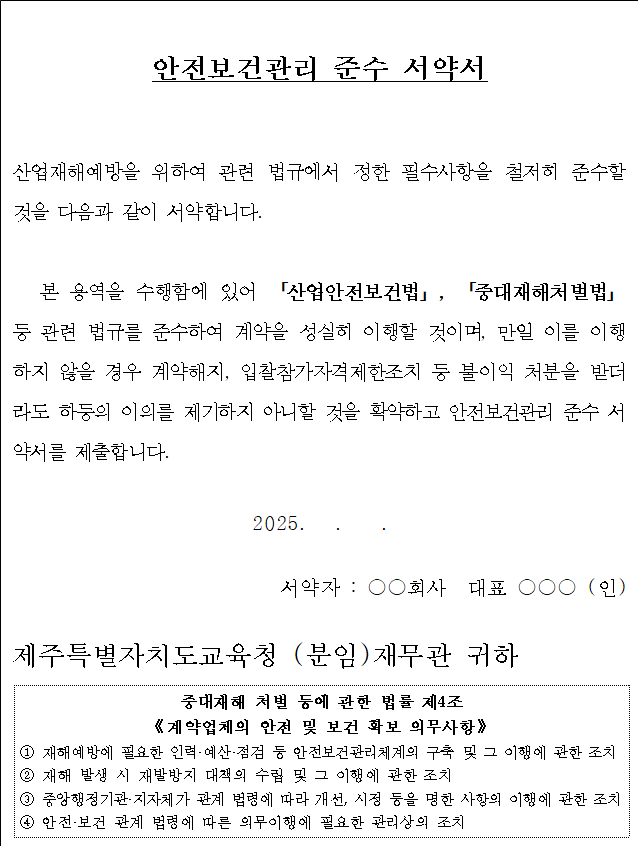 - 계약상대자로 선정된 업체는 대표자가 날인하여 계약체결 시에 제주특별자치도교육청에 별도로 제출하여야 합니다.