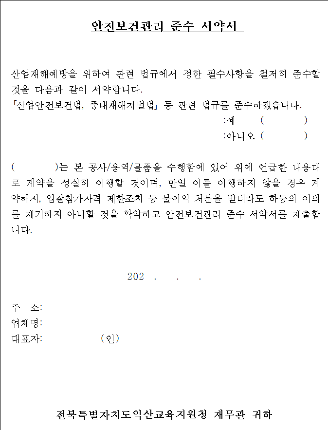 나. 입찰 참가자는 산업재해 예방을 위한 안전 및 보건에 관한 의무사항을 숙지하여 입찰에 응하여야 하며, 계약체결 시 [붙임] ‘안전보건관리 준수 서약서’를 제출하여야 합니다.