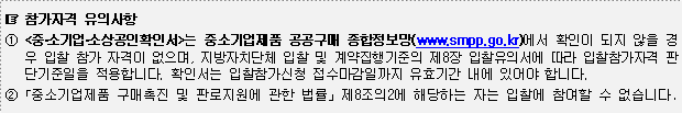 나. 입찰자는 입찰공고문, 용역계약일반조건 및 특수조건, 용역입찰유의서, 용역적격심사세부기준, 과업이행요청서, 관련법령, 관련 회계예규 등 입찰에 필요한 모든 사항을 사전에 숙지하고 입찰에 참가하여야 하며, 미숙지로 인한 책임은 입찰자에게 있습니다.