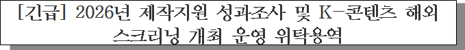 ㅇ 입찰건명 : 2026년 제작지원 성과조사 및 K-콘텐츠 해외 스크리닝 개최 운영 위탁용역