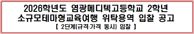 「지방자치단체를 당사자로 하는 계약에 관한 법률 시행령」제18조(2단계 입찰)의 규정에 따라 2026학년도 염광메디텍고등학교 소규모테마형교육여행 업체 선정을 위해 아래와 같이 공고합니다.