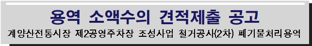 『계양산전통시장 제2공영주차장 조성사업 철거공사(2차) 폐기물처리용역』계약을 위하여 「지방자치단체를 당사자로 하는 계약에 관한 법률」제10조 및 같은 법 시행령 제30조, 지방자치단체 입찰 및 계약집행기준의 규정에 따라 붙임과 같이 수의견적 제출 안내 공고합니다.