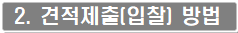 · 전자입찰의 견적서 제출은 조달청전자입찰 홈페이지의 전자입찰시스템을 이용하여야 하며 견적서 제출의 확인은 전자입찰시스템 보낸 문서함을 이용하시기 바랍니다.