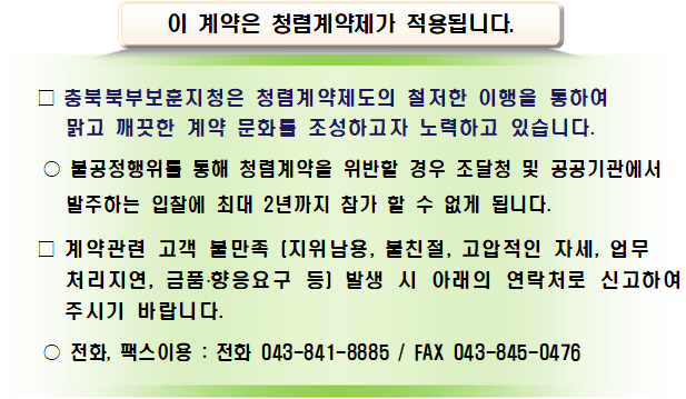 청렴계약이행준수 : 본건은 청렴계약이행 대상으로 입찰에 참가하는 자는 청렴계약이행을 위한 청렴계약입찰특별유의서 및 청렴계약특수조건을 자세히 알고 입찰에 참가하여야 합니다.