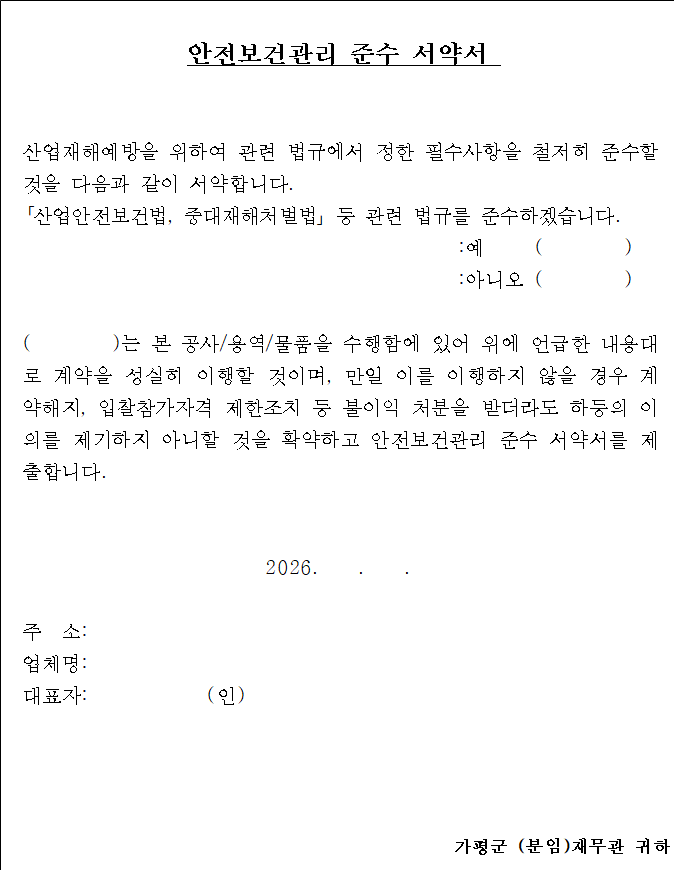 나. 본 입찰에 참가하고자 하는 자는 중대재해 예방을 위한 안전 및 보건 확보 의무사항을 숙지하신 후 입찰에 응하여야 하며, 계약 체결 시에 【붙임】「안전보건관리 준수 서약서」제출하여야 합니다.