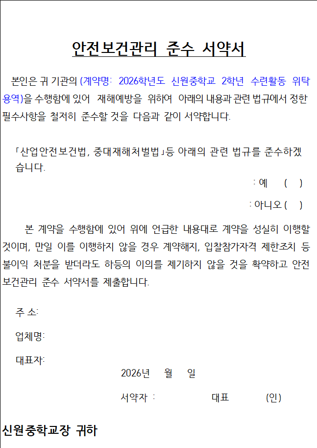 □ 정보이용 목적 : 2026학년도 신원중학교 2학년 수련활동 용역
