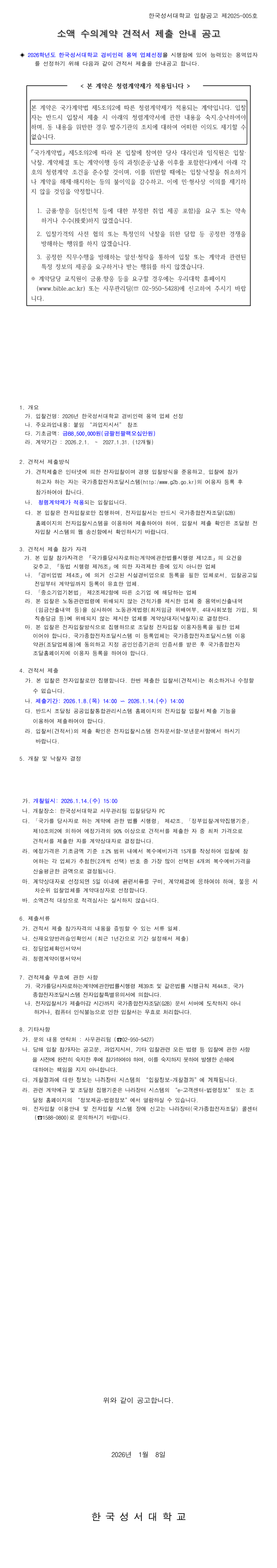 2026학년도 한국성서대학교 경비인력 용역 소액수의공고 |