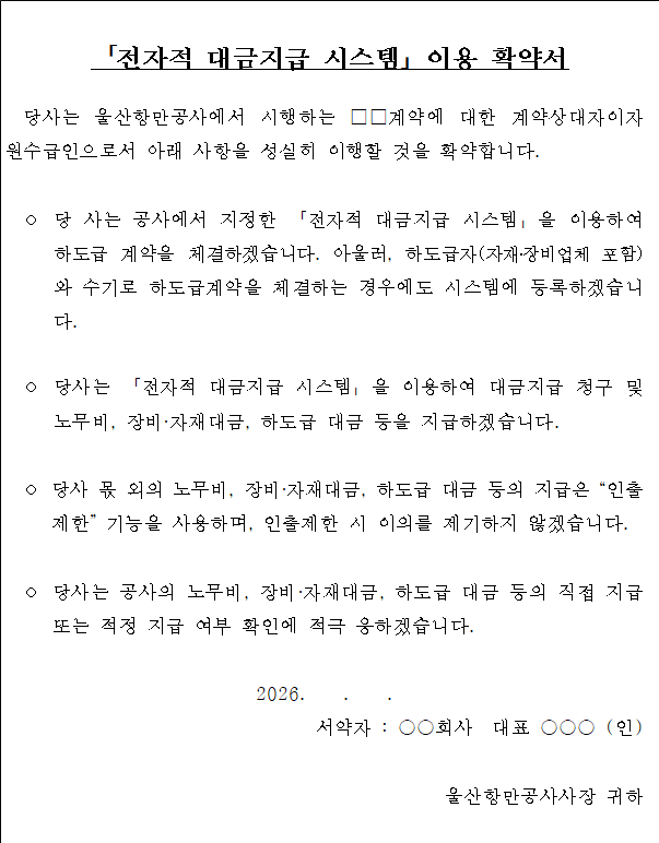 나. 입찰에 참여하는 자는 입찰서 제출 시 [붙임2] ‘전자적 대금지급 시스템 이용 확약서’를 제출하여야 합니다. 다만, 나라장터를 이용하여 입찰서를 제출하는 경우에는 전자입찰서에 ‘전자적 대금지급 시스템 이용 확약서’ 내용을 포함한 것으로 보고 전자입찰서 제출로 확약서 제출을 갈음합니다.