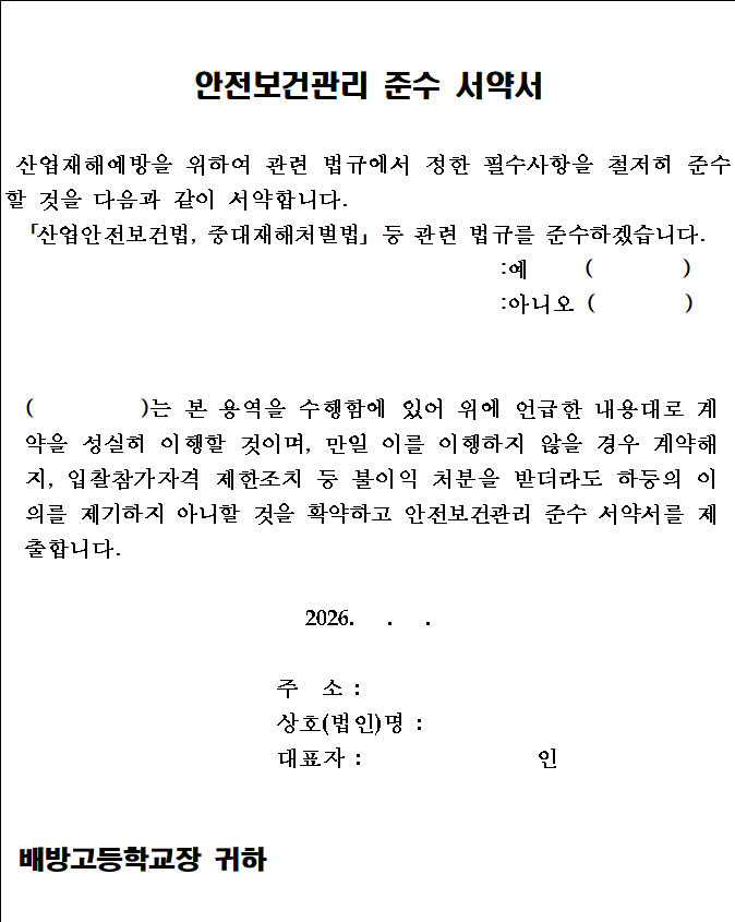 가. 견적에 참가하는 모든 업체는 배방고등학교 청렴계약견적특별유의서에 의하여 청렴계약 이행서약서(업체 제출용)를 제출하도록 되어 있으나, 동 유의서 제2조 제1항에 따른 청렴계약 이행각서를 제출한 것으로 간주합니다.