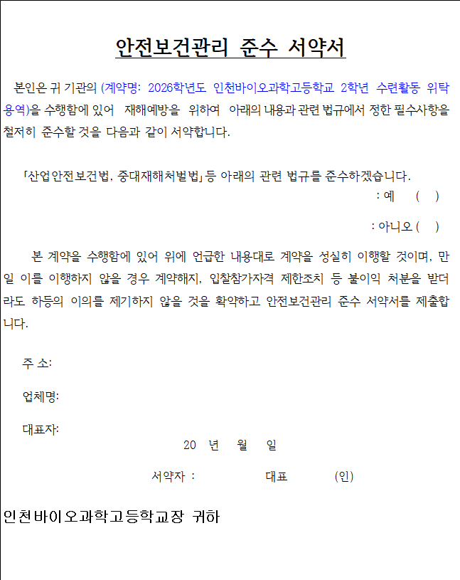 [긴급] 2026학년도 인천바이오과학고등학교 2학년 수련활동 위탁 용역 공고