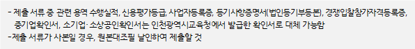 ※ 용역이행 실적증명서, 관련 용역 수행실적, 신용평가등급, 사업자등록증, 등기사항증명서(법인등기부등본), 경쟁입찰참가자격등록증은 학교지원단에서 발급한 확인서로 대체 가능함