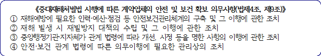 나. 입찰에 참여한 자는 중대재해 처벌 등에 관한 법률 제4조 및 제9조에 따라 다음의 안전보건 확보 의무사항을 숙지하여야 하며, 최종 낙찰자로 선정된 업체는 안전보건관리 준수 서약서를 계약 체결 시 제출하여야 하고, 우리공사가 안전·보건과 관련된 의무를 준수하는지 평가·점검·시정 요청 할 수 있으며 이 경우 협조하여야 합니다.