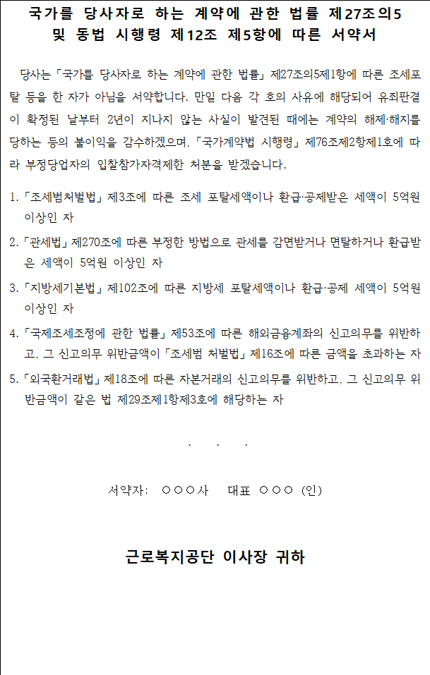 처분을 받을 수 있습니다. (다만, 나라장터 시스템을 이용하여 제출하는 경우에는 전자입찰서에 동 서약서의