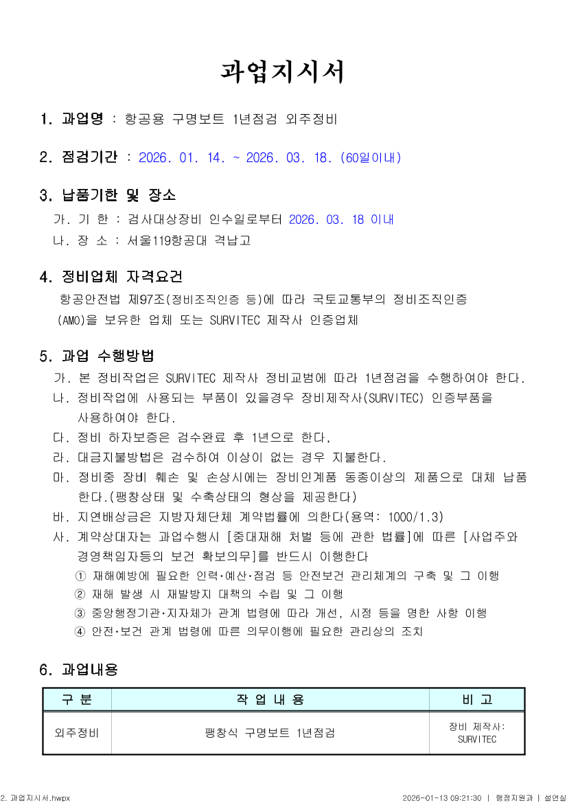 2026년 소방헬기 구명보트 정기검사 외주정비 용역 |