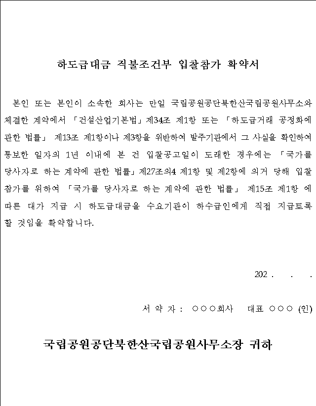 이 안내서는 북한산국립공원사무소에서 집행하는 계약에서 입찰자와 계약상대자가 숙지하고 준수하여야 할 사항을 기재한 것으로서 본 입찰에 참여하는 모든 업체는 이를 열람하여야 합니다. 전자입찰에 참가하고자 하는 자는 다음의 공고서 등을 반드시 열람하여 그 내용을 숙지하여야 합니다. 본 안내와 관련하여 추가로 문의할 사항은 아래의 담당자에게 연락하시기 바랍니다.