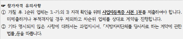⦁ 미자격자가 참가한 경우 또는 「지방자치단체를 당사자로 하는 계약에 관한 법률」시행령 제92조에 해당한다고 판단될 경우에는 관계 규정에 의거 제재 받을 수 있습니다.