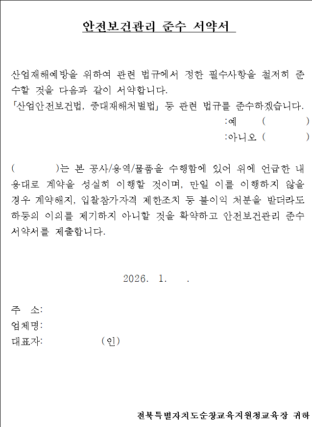 나. 본 입찰에 참가하고자하는 자는 중대채해 예방을 위한 안전 및 보건 확보 의무사항을 숙지하신 후 입찰에 응하여야 하며, 계약 체결 시에 【붙임1】「안전보건관리 준수 서약서」를 제출하여야 합니다.