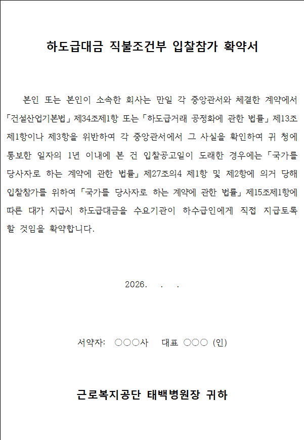 ② ①에 따라 확약서를 제출하여야 하는 자는 입찰서 제출시 (붙임2)“하도급대금 직불조건부 입찰참가 확약서”를 반드시 제출하여야 합니다.