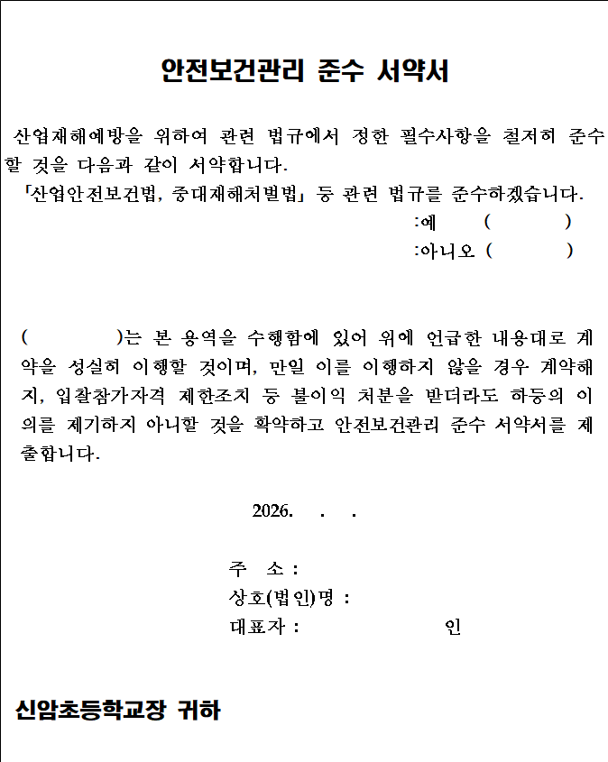 다. 낙찰자로 결정된 업체는 계약 체결 시 【붙임 1】 안전보건관리 준수 서약서를 대표자가 서명 후 제출하여야 하며, 「중대재해 처벌 등에 관한 법률」 및 「동법 시행령」에 따른 세부 이행사항을 준수하여야 합니다.