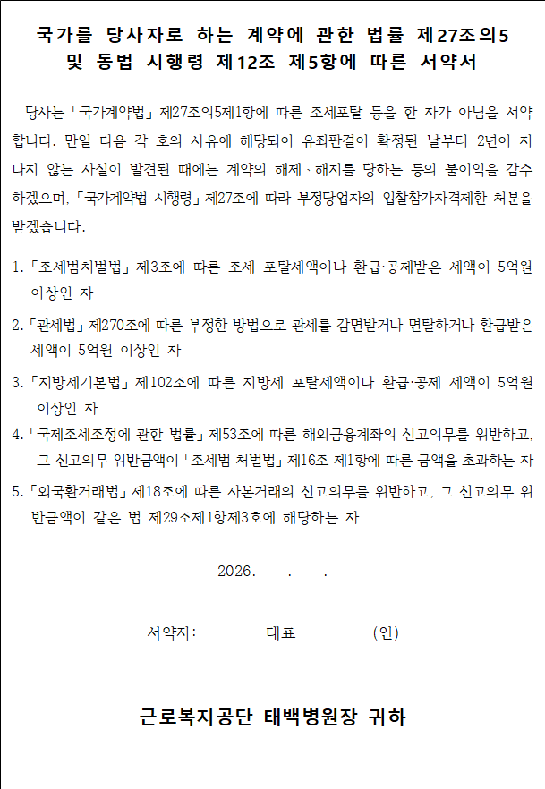 당사는 근로복지공단에서 시행하는 “태백병원 간병지원인력(요양보호사) 파견 용역” 계약업체로서 근로자(하도급 업체 포함)의 인권보호·고용안정·노동환경 등의 권리보호를 위해 다음 사항을 이행할 것을 서약합니다.