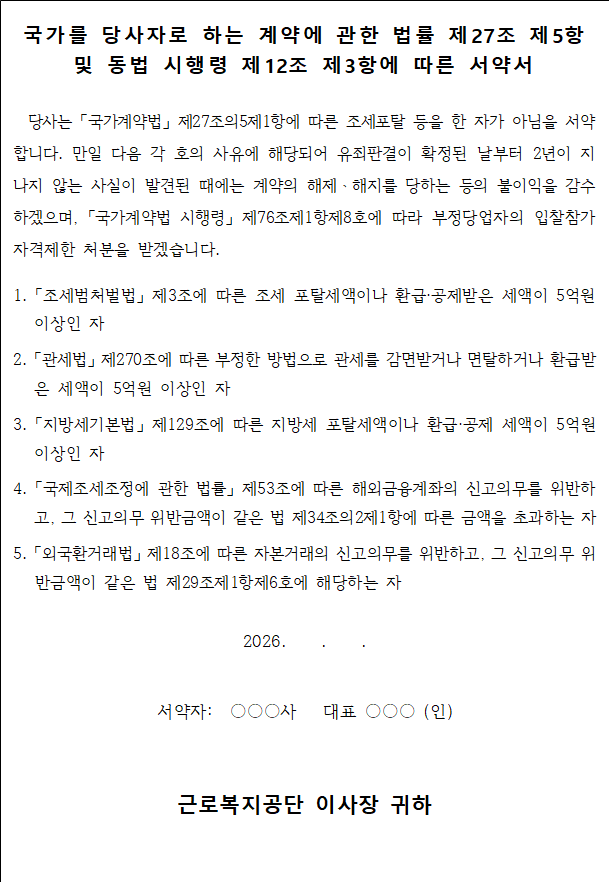 2) 입찰자는 「같은 법 시행령」 제12조제3항각호에 해당하지 아니한다는 서약서를 입찰시 제출하여야 합니다.