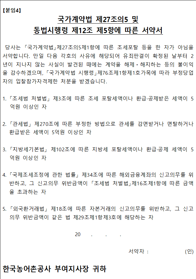 4) 견적제출 참가업체는 국가를 당사자로 하는 계약에 관한 법 제27조의5 제1항 및 동법 시행령 제12조제3항에 의거 조세포탈 등을 한 사실이 없는 것으로 간주하며, 조세포탈 등의 사실이 확인될 경우 계약 해제·해지, 부정당업자제재 등의 처분을 받을 수 있습니다. 또한 계약상대자로 선정되는 자는 계약체결 시 “조세포탈 유무 확인 서약서”를 제출하여야 합니다.