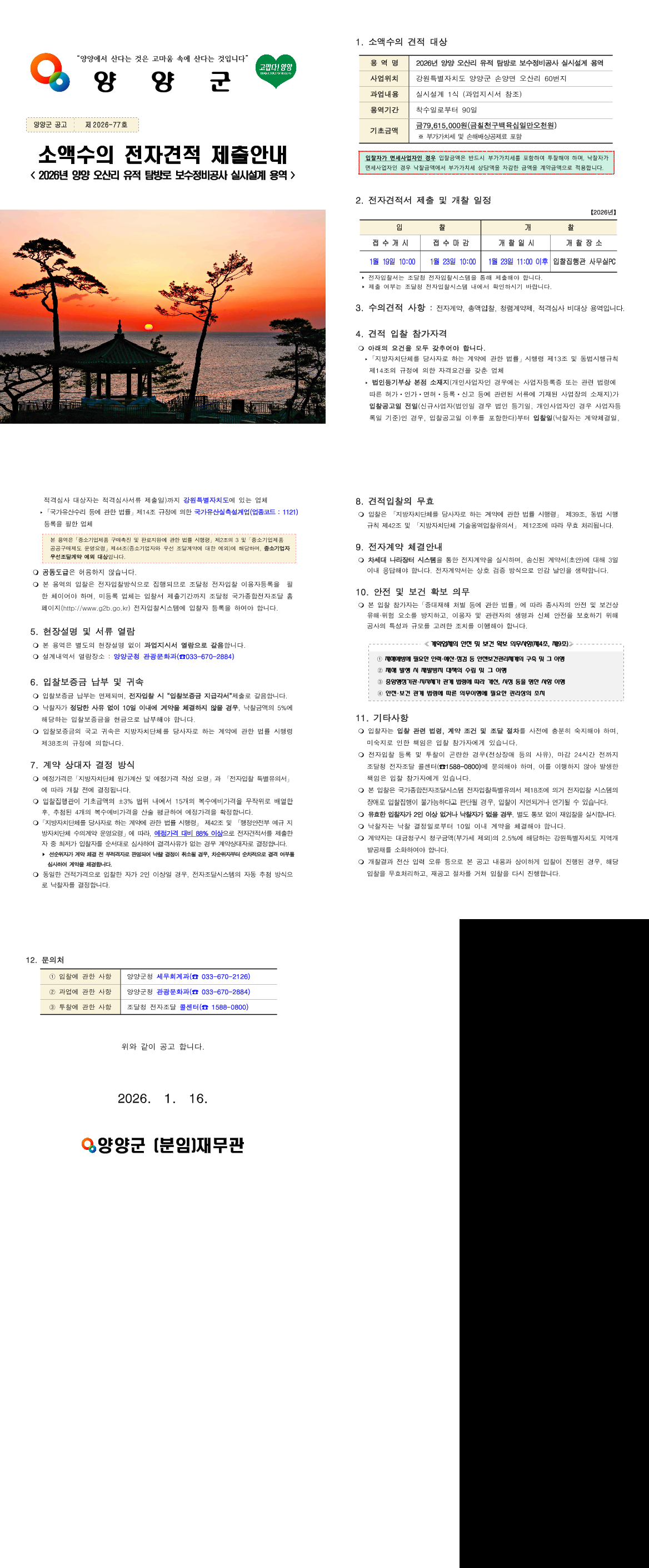 2026년 양양 오산리 유적 탐방로 보수정비공사 실시설계 용역 소액수의 전자견적 제출안내 |