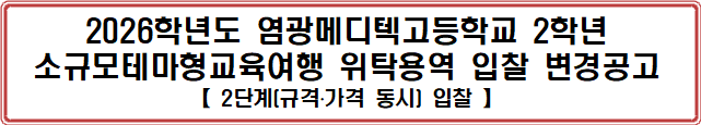「지방자치단체를 당사자로 하는 계약에 관한 법률 시행령」제18조(2단계 입찰)의 규정에 따라 2026학년도 염광메디텍고등학교 소규모테마형교육여행 업체 선정을 위해 아래와 같이 공고합니다.