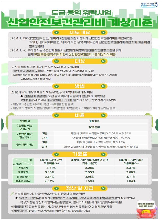 가. 계약대상자는 입찰(과업수행)시 산업재해예방을 목적으로 하는 안전보건관리비를“울산항만공사 안전보건관리비 산출기준(붙임2)”에 따라 계산된 금액으로 계상하여야 하며 기성, 준공검사시 안전보건관리비의 사용 내역과 증빙자료를 제출하고 준공시 사후 정산하여야 합니다.