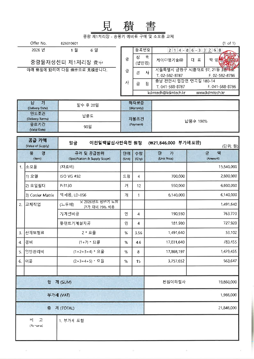 포기용송풍기(M-701A #1) 소모품 구매·교체, 역세용송풍기(M-701B #2) 오일쿨러 교체 |